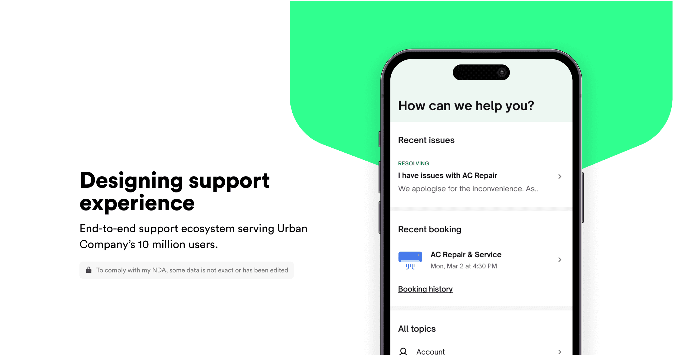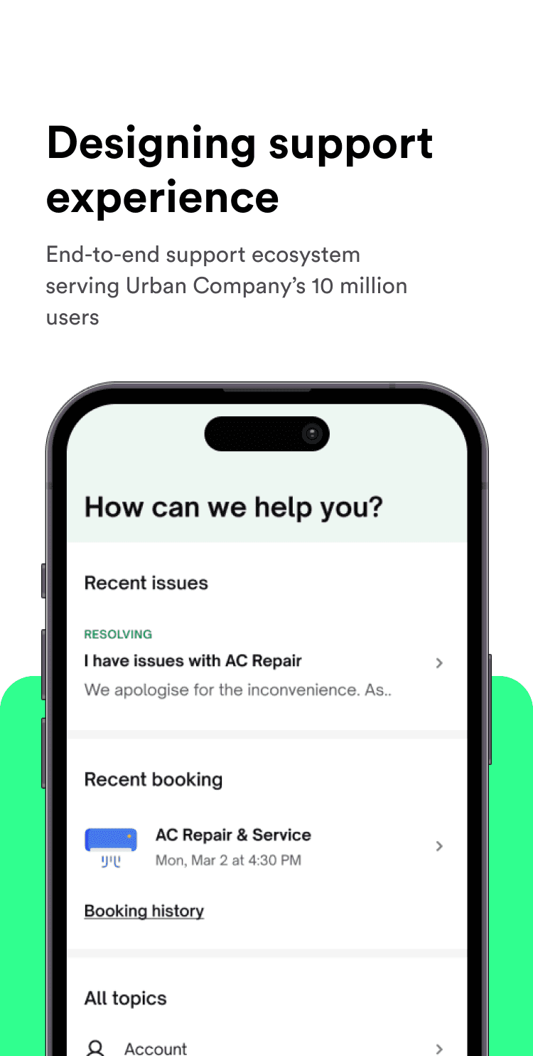 Reducing support contacts by 15% & revamping the help center with Urban Company's new design system. This strategic move was made to reduce overall support costs and minimize business expenses