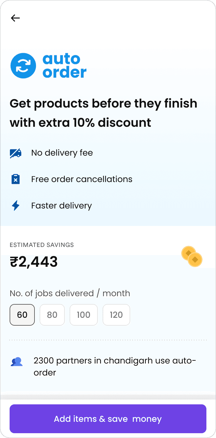 Algo automatically orders subscribed items whenever the item goes low on stock. This prevents manual labour to track and order which makes the partner focus only on their jobs.