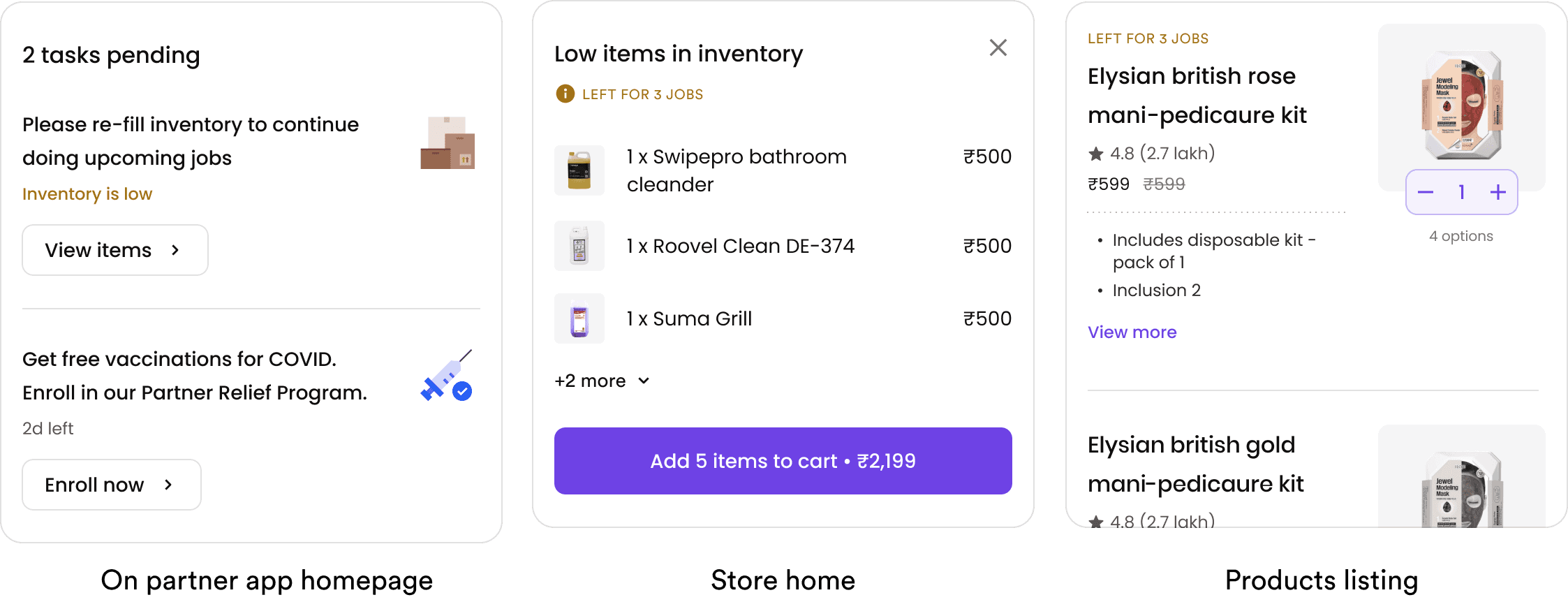 Our inventory predictive model predicts “how many jobs are left with the current inventory ”with 90% accuracy . When inventory is low, we notify the partner at several places in the app to remind them to buy it. This reduces cognitive load to remember items are going out.