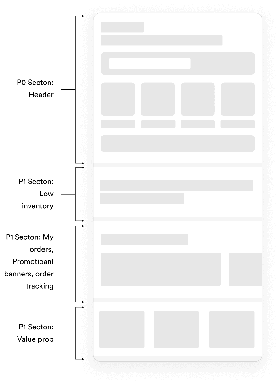 P0 Section is kept sticked at the top and is the main header consisting product categories, search, address, auto-order.