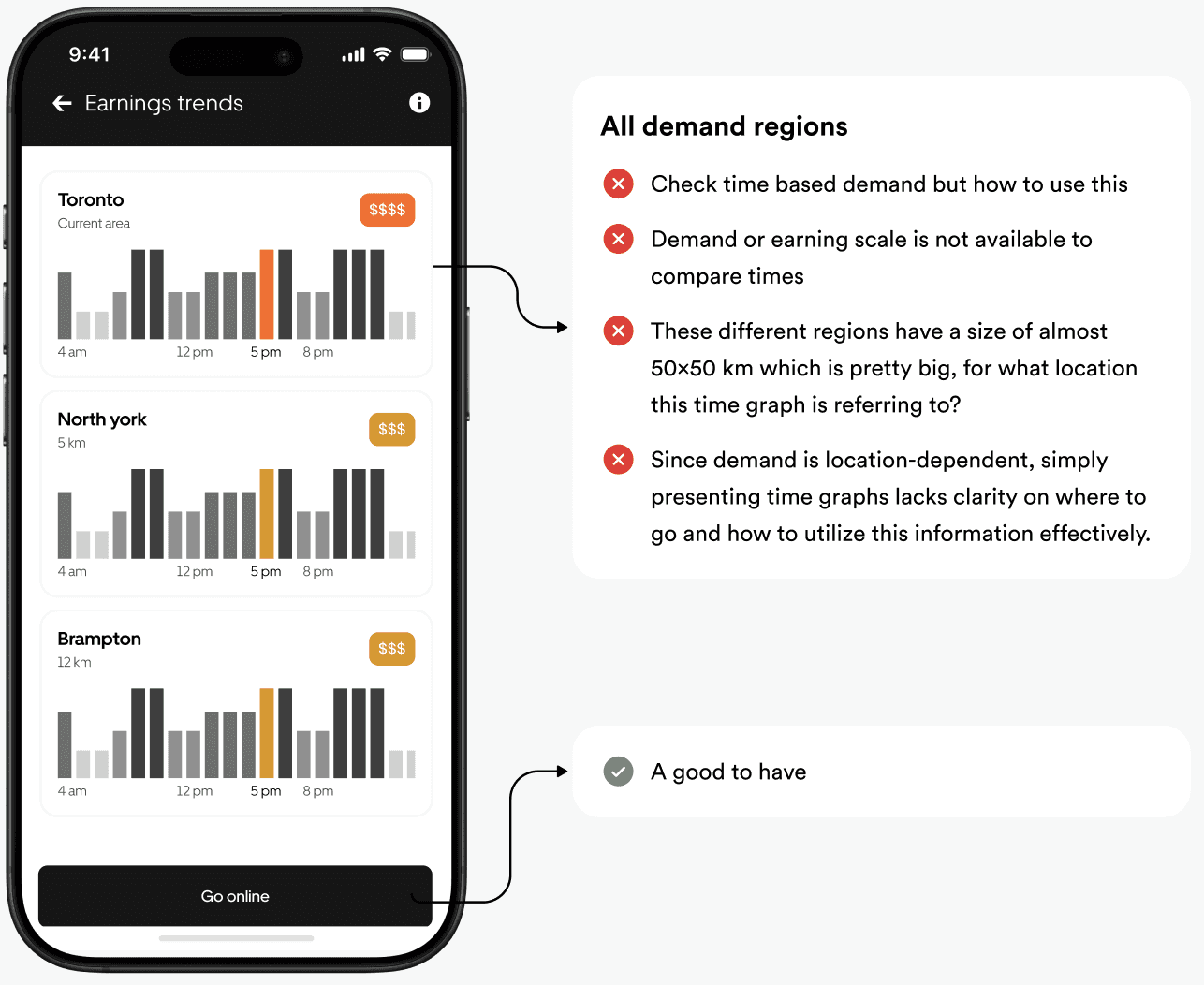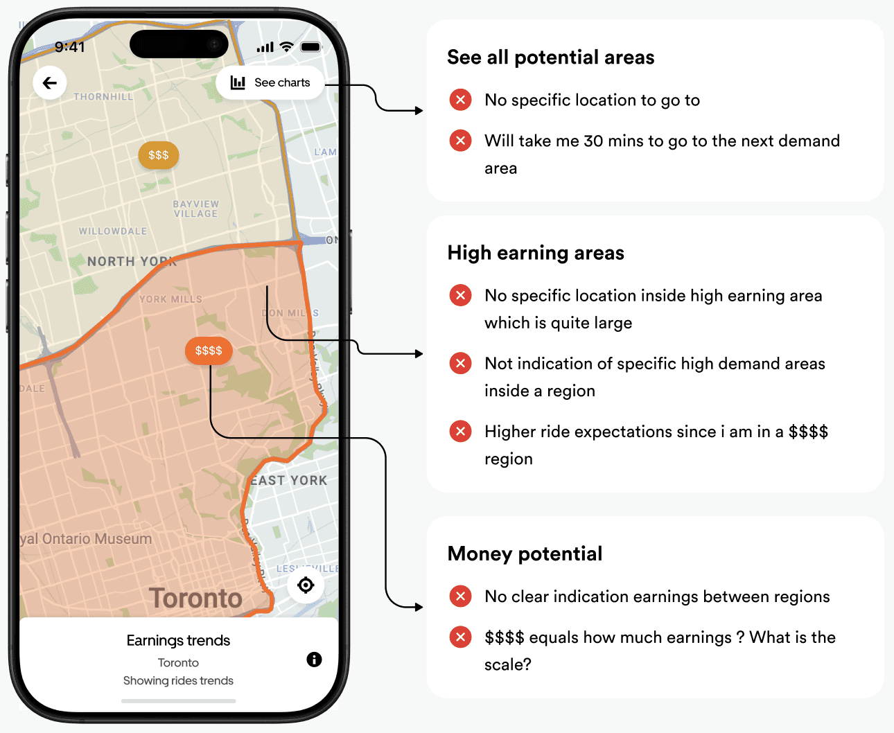 Although Uber provides a region maps to highlight demand areas, it comes with several limitations. In the interview, drivers have specifically pointed out these issues when asked about the usability and effectiveness of the feature.